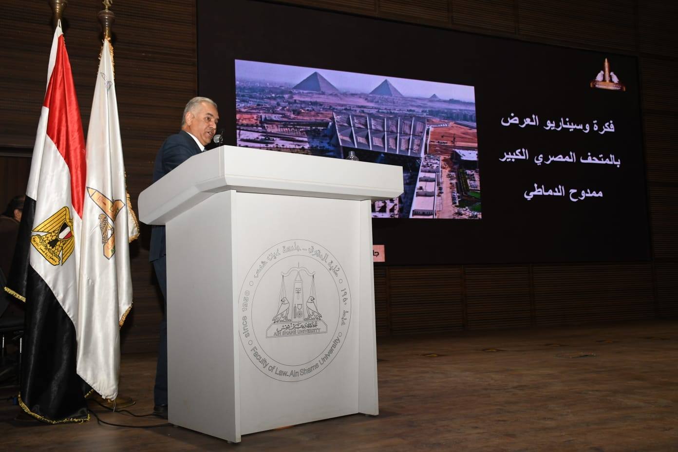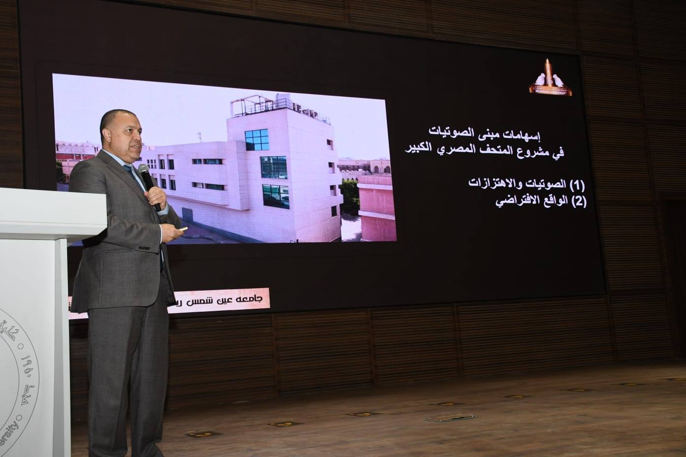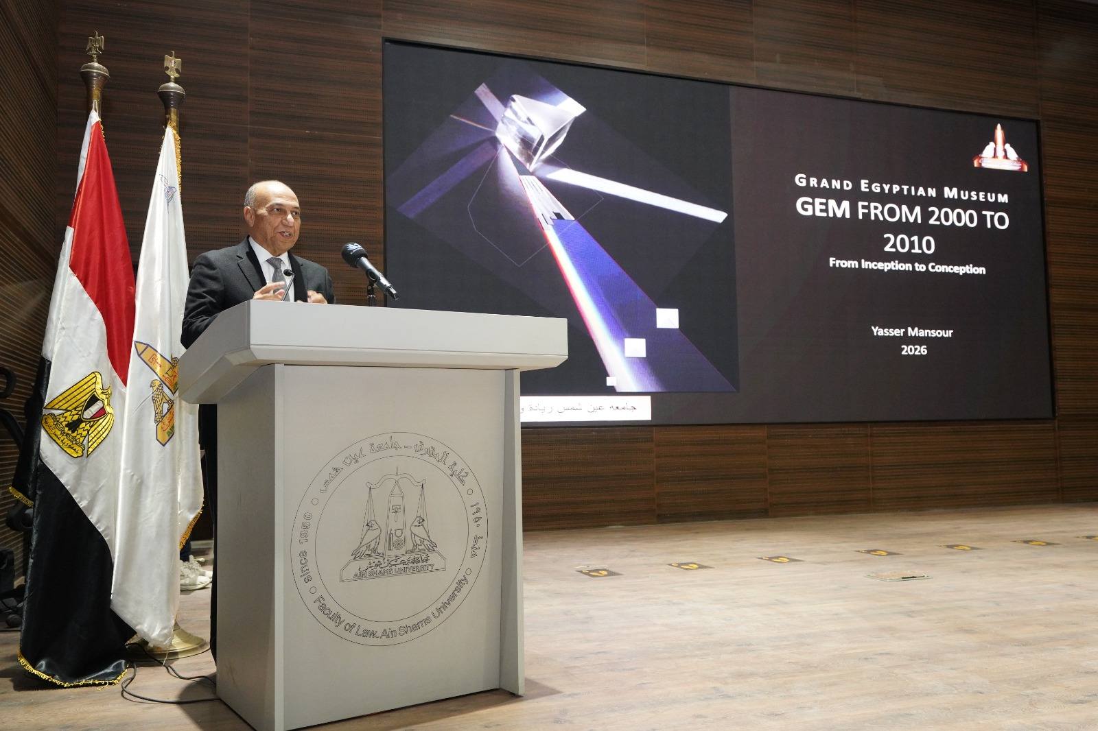 وشهدت الاحتفالية عددًا من العروض العلمية المتخصصة، حيث استعرض الأستاذ الدكتور ياسر منصور، الأستاذ المتفرغ بقسم الهندسة المعمارية والمنسق العام لمشروع المتحف المصري الكبير، فكرة إنشاء المتحف منذ ما قبل عام 2002، ودوره في إدارة وتنسيق جميع جوانب المشروع، بدءًا من مسابقة التصميم الدولية وحتى مراحل التنفيذ المختلفة.