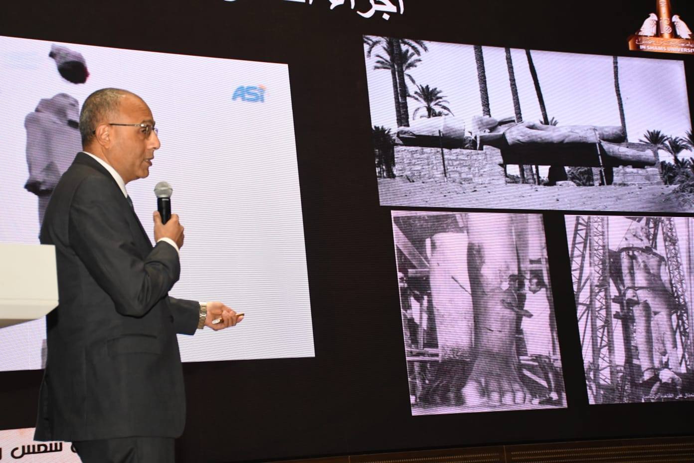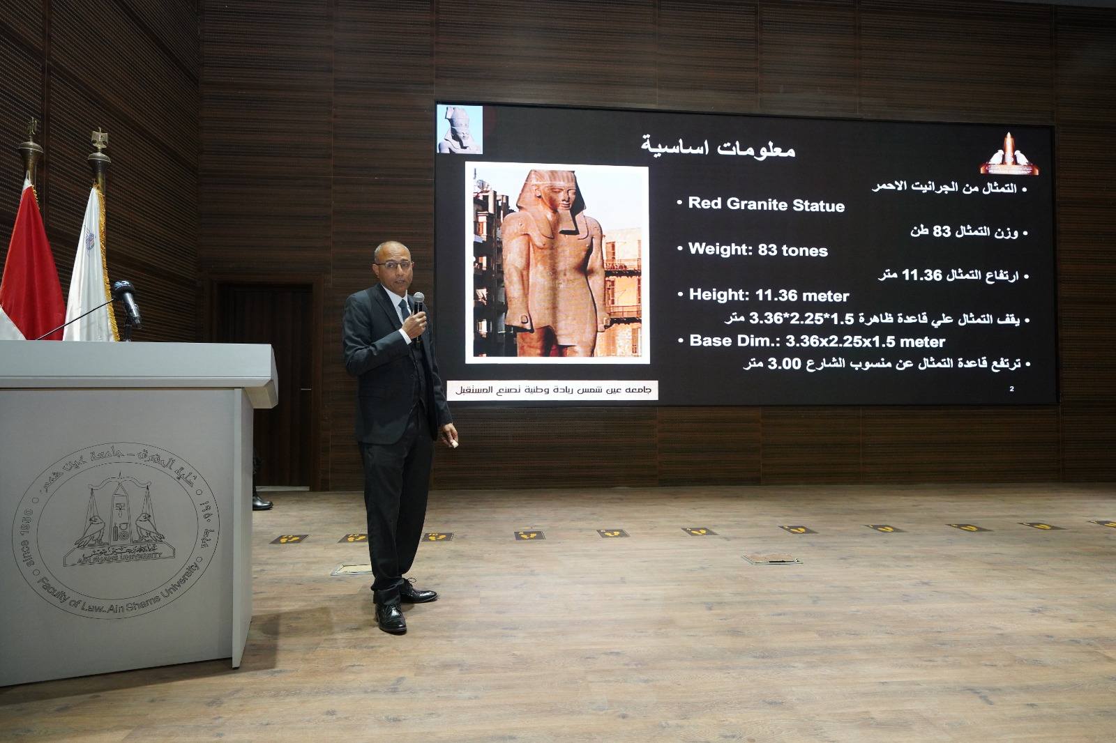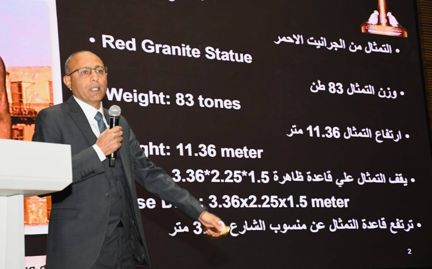 كما قدّم الأستاذ الدكتور مصطفى رستم أحمد عطية ، أستاذ الهندسة الميكانيكية عرضًا وافيًا حول مشاركته في نقل تمثال رمسيس الثاني والقطع الأثرية الثقيلة، موضحًا الجوانب الهندسية الدقيقة لتلك العملية التاريخية.