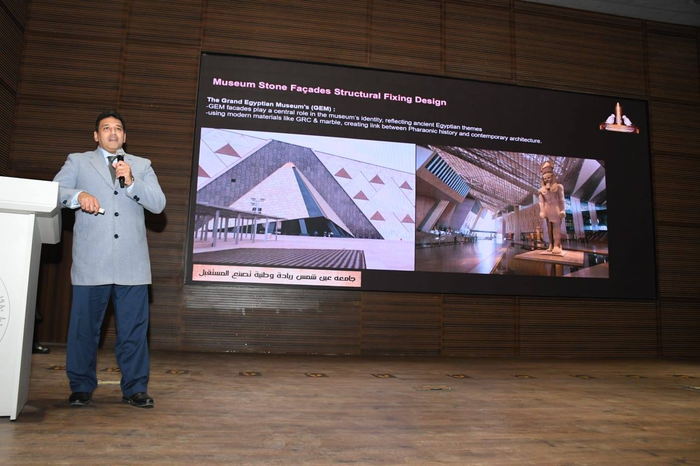 فيما استعرض الأستاذ الدكتور فتح الله محمد النحاس ، أستاذ متفرغ الهندسة الجيوتقنية والأساسات بقسم الهندسة الانشائية ، مساهماته في اختبارات التربة والأساسات، وقدم الدكتور تامر حنفي رضوان، الأستاذ المساعد بقسم الهندسة الإنشائية عرضًا متخصصًا حول تصميم واجهات المتحف المستوحاة من هندسة الأهرامات باستخدام الرخام المصري.