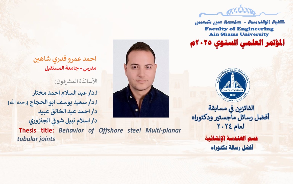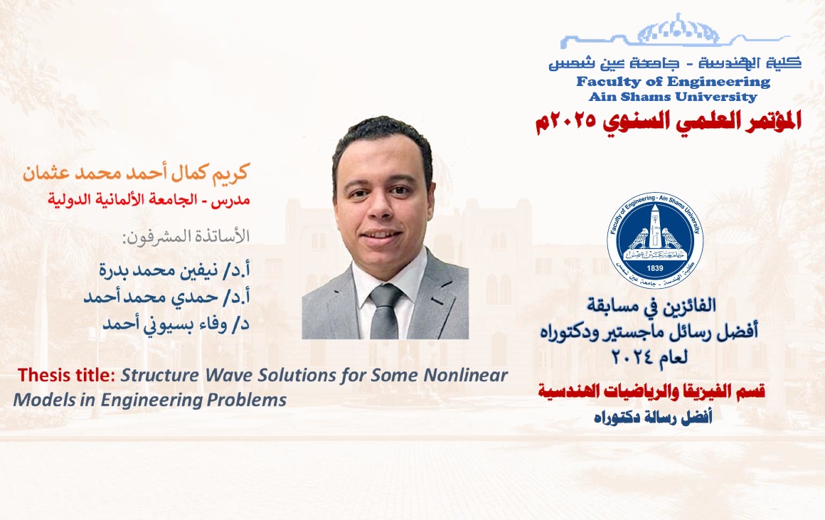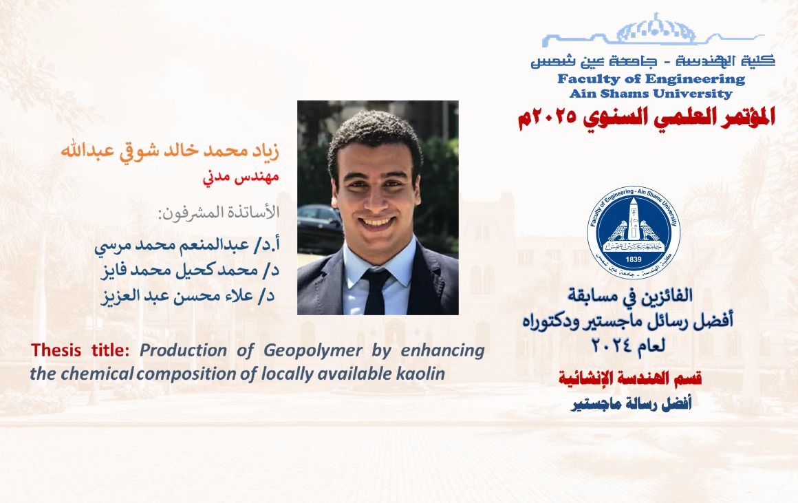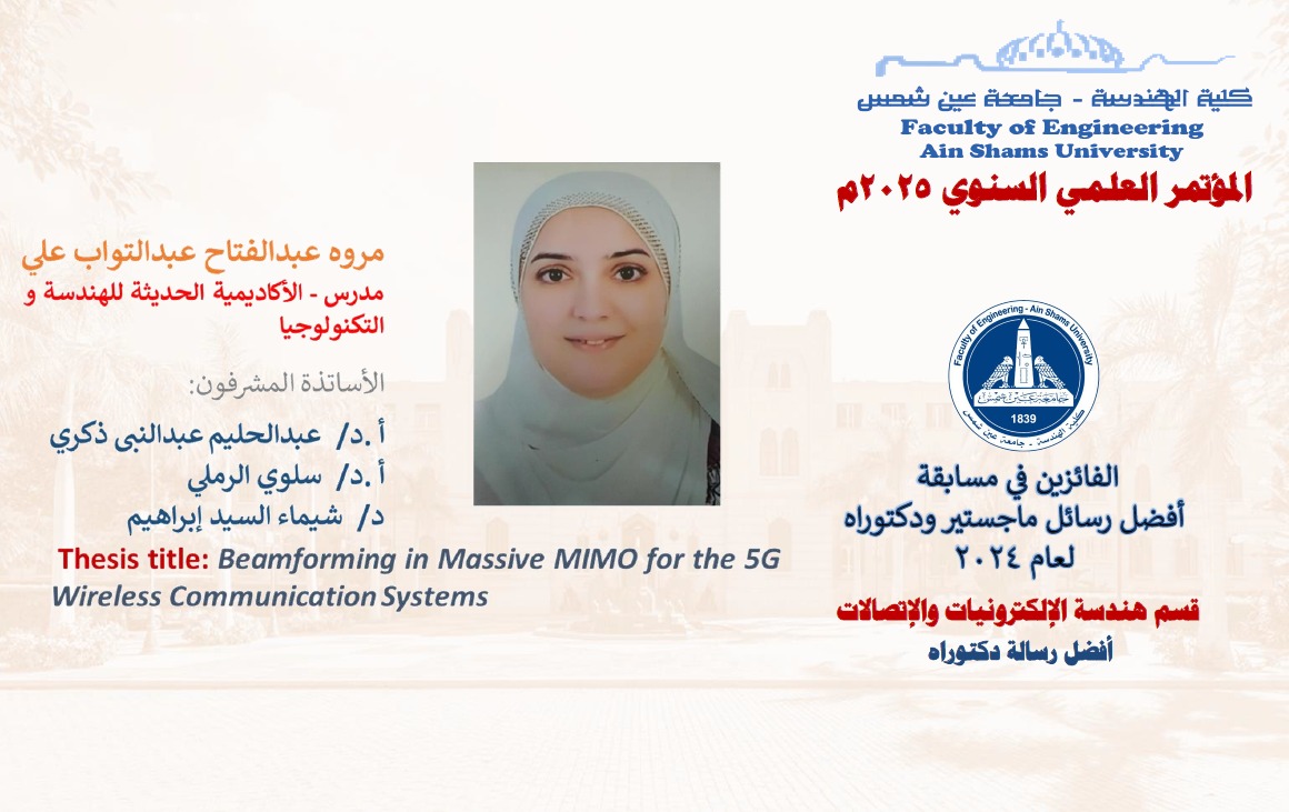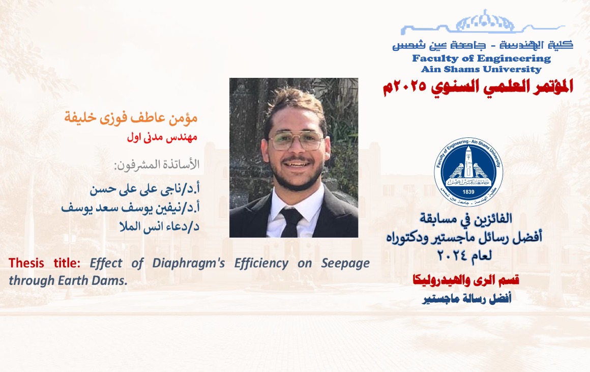 في أجواء من الاعتزاز والفخر شهدت كلية الهندسة – جامعة عين شمس تكريم الفائزين في مسابقة أفضل رسائل علمية (ماجستير – دكتوراه) للعام الجامعي 2023-2024 ، وذلك ضمن فعاليات المؤتمر العلمي السنوي للكلية.