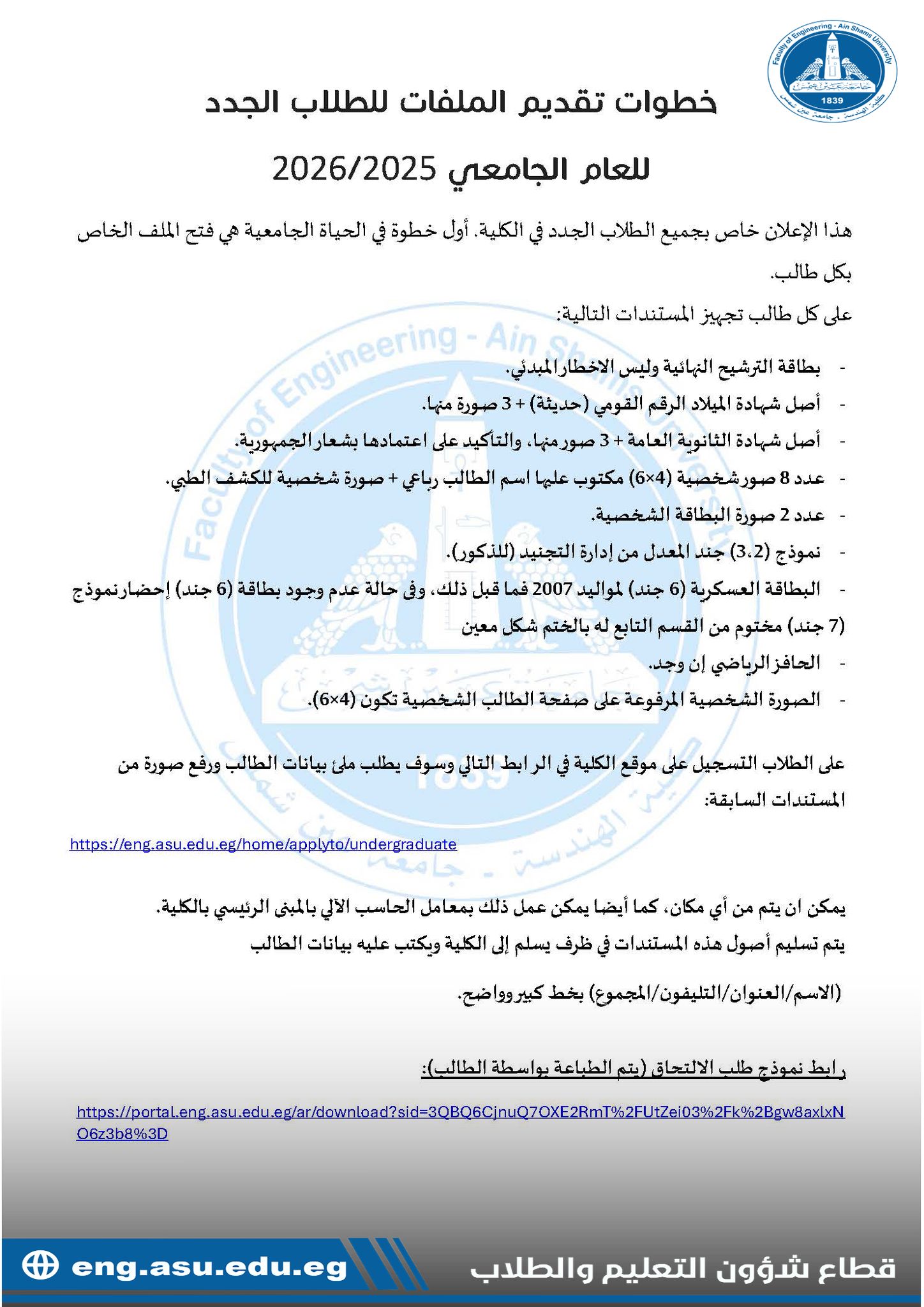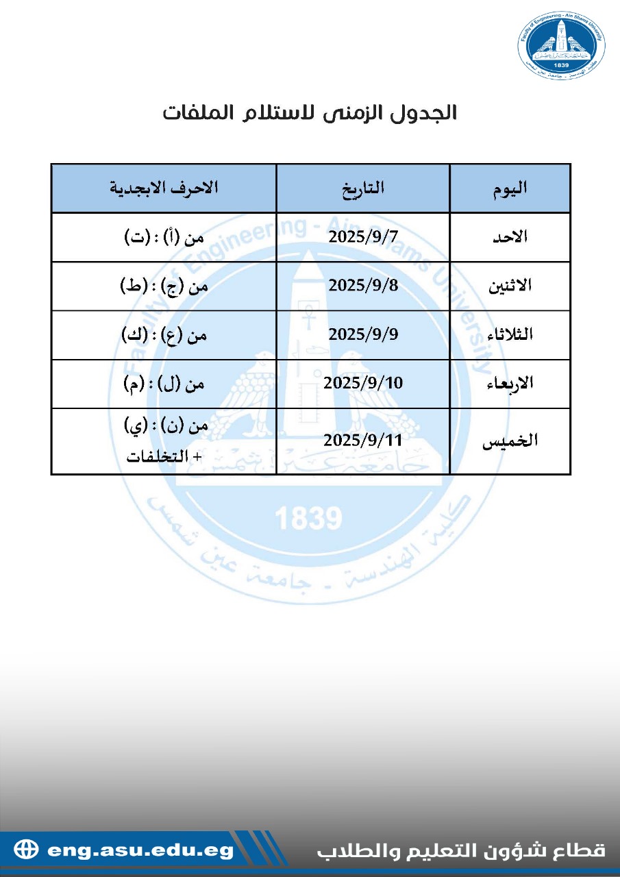 إعلان بمواعيد التقدم بفتح الملفات للطلاب الجدد المرشحين للعام الأكاديمي 2025-2026