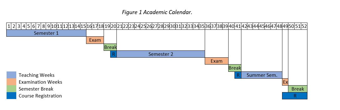 Summer semester: Begins late June or early July and lasts for 7 weeks followed by 1 week of examination. Course registration takes place within 1 week before the starting day of the semester.