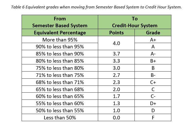 The following table is used to calculate the equivalent grades when transferring the student from the Semester-Based system to the Credit-Hour system.
