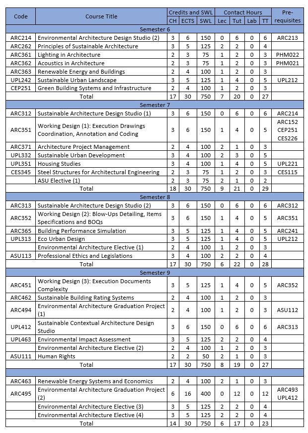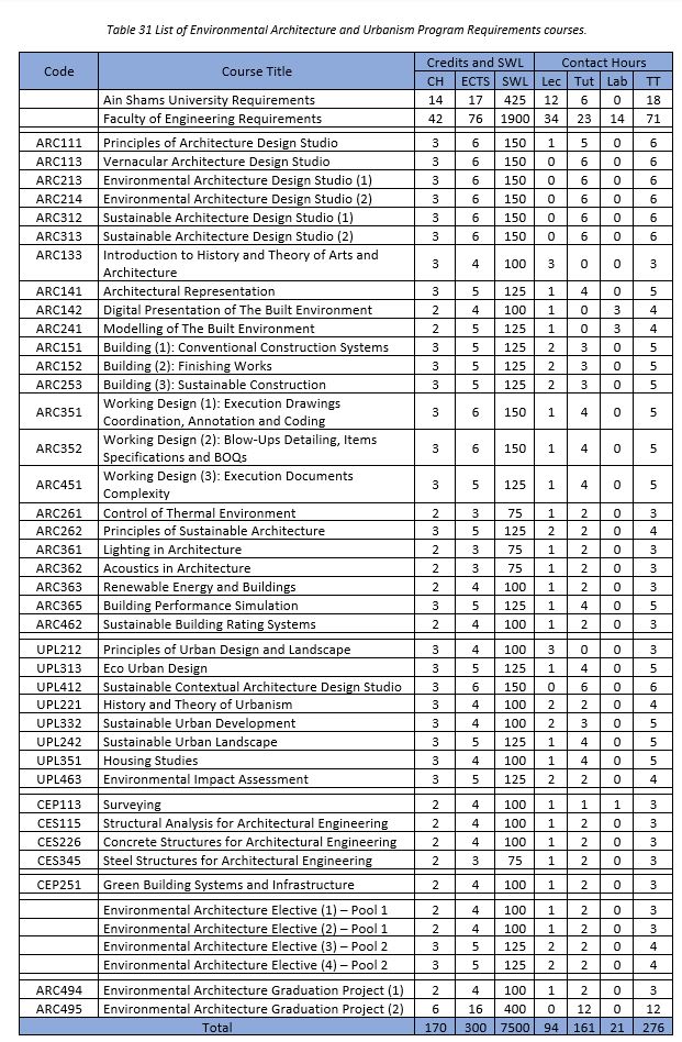 Driven by the current urgency of building more environmentally friendly buildings and cities, the environmental Architecture and Urbanism Program (ENVR) aims at preparing architects and urban designers specialized in environmental design. Graduates are capable of understanding the relationship between humans and buildings and between buildings and their environment. They can integrate all the aspects dealing with the built environment and how it is planned, designed, used, furnished, landscaped, managed, and valued by the society in their creative thinking while dealing with complex architectural and urban environment problems. The program introduces students to building science and enables them to conceive the basic concepts of sustainable architecture and urbanism. They are trained to balance functional and ecological demands when developing policies or designs for new construction. Graduate will be able to deal with modern techniques and tools for learning and linking theory and practice. All efforts are directed towards achieving environmental architecture and urbanism.