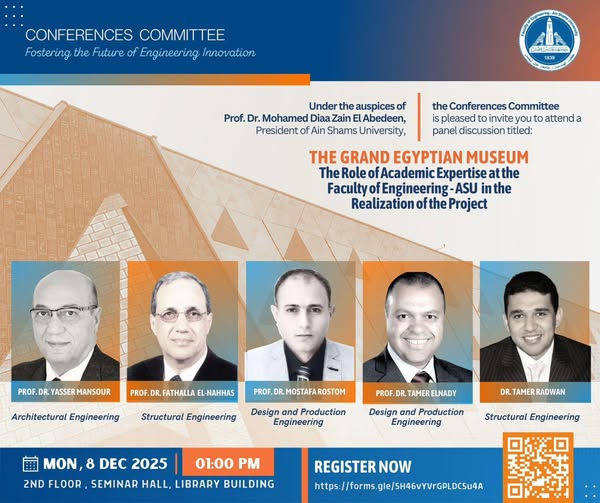 On the occasion of the official opening of the Grand Egyptian Museum, we proudly honor the role played by our esteemed professors at the Faculty of Engineering – Ain Shams University in the realization of this historic project.