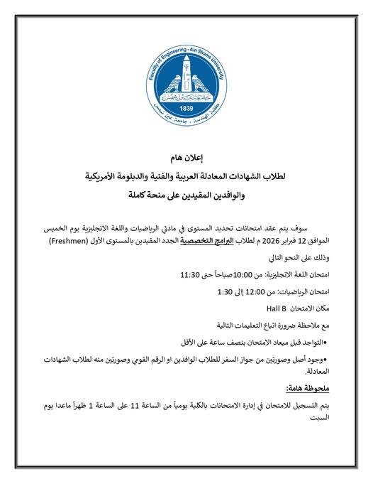 إعلان: لطلاب الشهادات المعادلة العربية والفنية والدبلومة الأمريكية والوافدين المقيدين على منحة كاملة