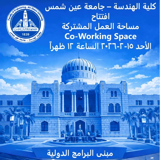 تحت رعاية الأستاذ الدكتور عمرو شعت، عميد الكلية، والأستاذ الدكتور محمد عبدالعزيز، وكيل الكلية لشؤون التعليم والطلاب، والأستاذ الدكتور أكرم فاروق، وكيل الكلية لشئون خدمة المجتمع وتنمية البيئة وفي إطار حرص كلية الهندسة على توفير بيئة تعليمية داعمة ومحفزة للابتكار والعمل الجماعي، سيتم افتتاح مساحة العمل المشتركة (Co-Working Space) بكلية الهندسة، وذلك يوم الأحد الموافق 15-2-2026 في تمام الساعة 12 ظهرًا، وذلك بمبنى البرامج الدولية.
