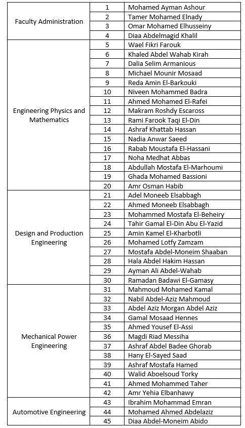 The following list shows the staff members of the Faculty of Engineering, Ain Shams University who have effectively participated in the preparation of the 2018 Bylaws for the Undergraduate Studies.